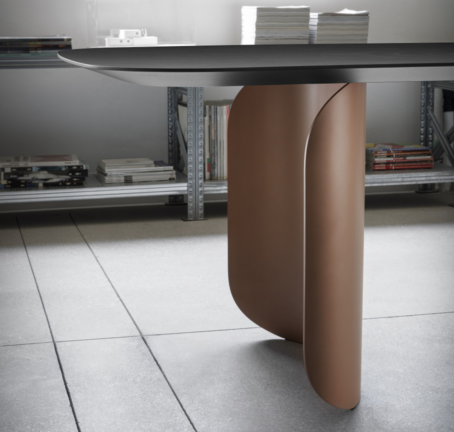 Available in three sizes, the table top is rectangular in shape with rounded ends, with a wide range of options for the table top. Choose from; matt lacquered wood, solid oak, ash or walnut, as well as a ceramic finish in variety of colours, or finally luxurious marble. The lacquered metal legs can be selected in a number of colours to match or contrast the table top.