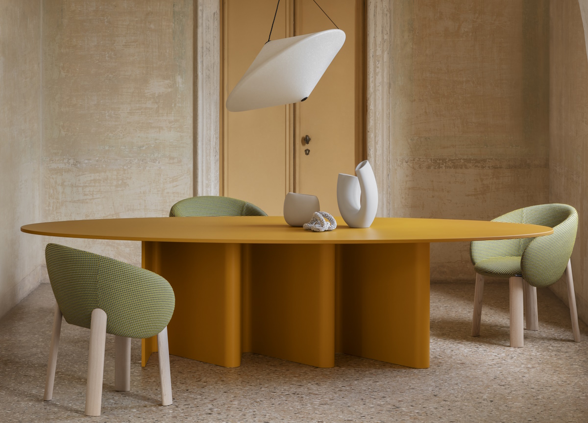 This is the oval Miniforms Nami dining table by E-ggs whose name echoes the sinuous inspiration of its base, crafted in bent wood. In the hands of the expert Miniforms craftsman, the material seems almost elastic, modelled to express character and musicality.