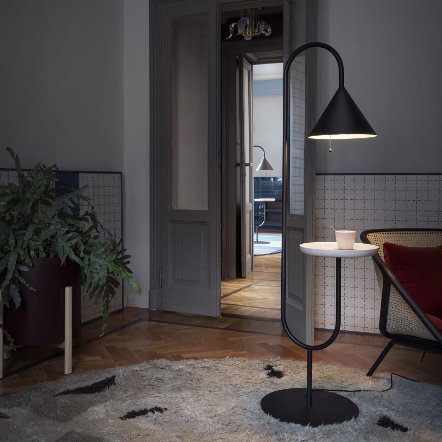 When Ozz is switched off, it serves as a small coffee table; when the lamp is on, it creates a warm, welcoming space where light seems to gather around the top, creating a homely intimacy. The structure is made from black lacquered metal whilst the useful tray is in solid natural ash.