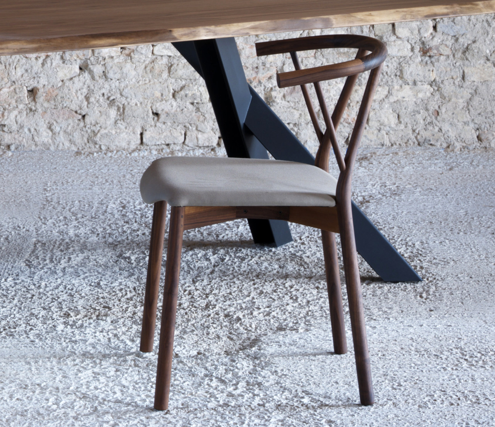This modern dining chair has a strong solid wood frame with a curved backrest providing maximum support. The frame can be selected in flamed oak, black aniline or walnut stained aniline. Aniline is where the grain of the wood is still visible through the lacquer.