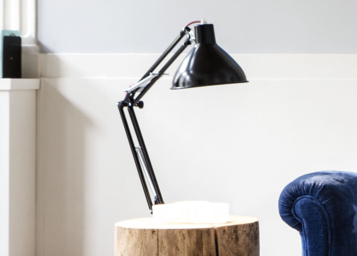 The lamp is available in black or white, with a satin nickel support & a 3 metre long red fabric covered wire (part of the design too). The bulb (max 60W) is not included. There is also a low version, which is a side table & lamp combined - see related products below.