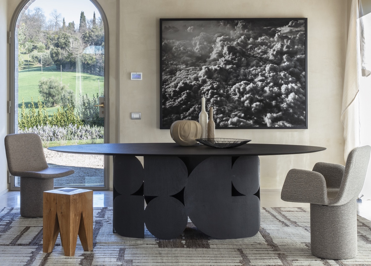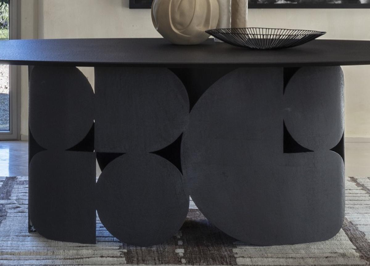The Mogg Shape oval dining table by Uto Balmoral will add a strong look to any living space, the combination of a central perforated metal base and a wooden table top create an elegant aesthetic balance.