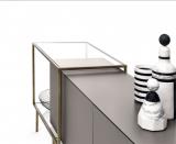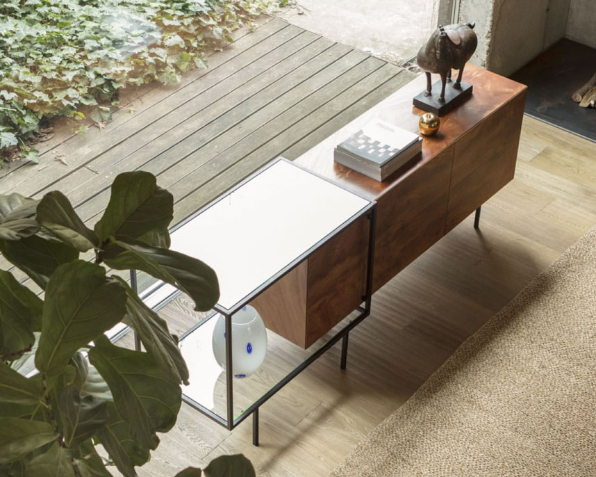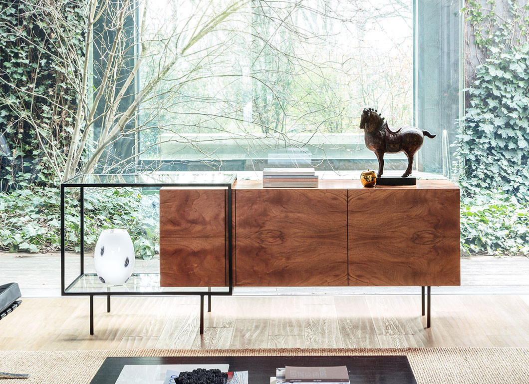 The Zoom Sideboard frame is metal, which can be finished in black or patinated bronze for a unique finish. The sideboard body is made from a wooden frame which is finished in a mahogany feather veneer or lacquered in a colour of your choice.