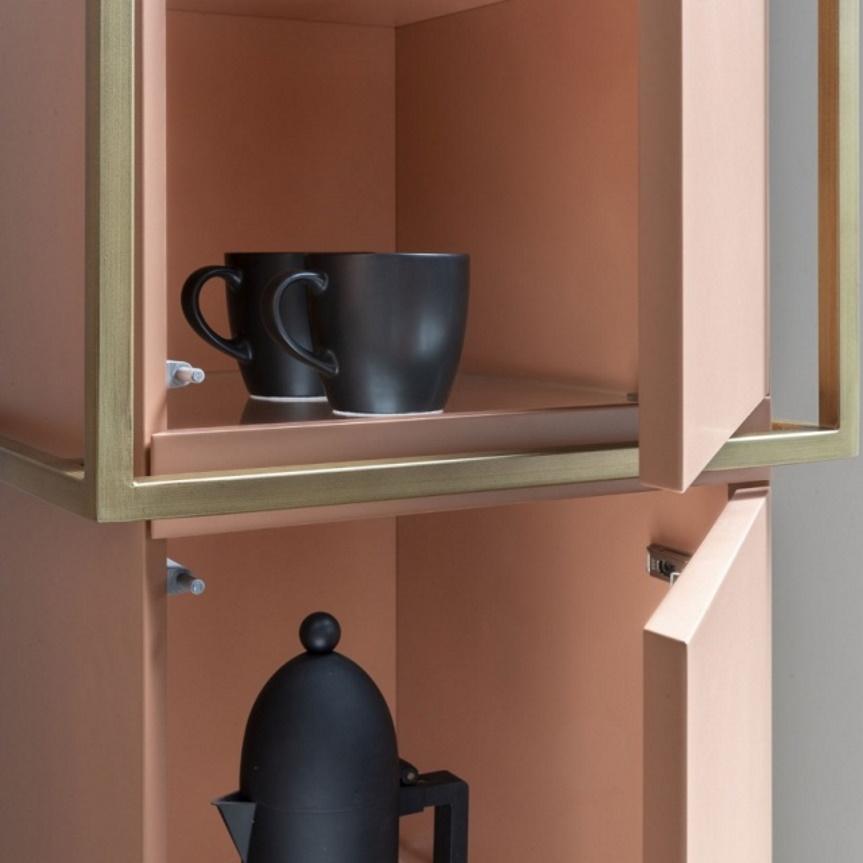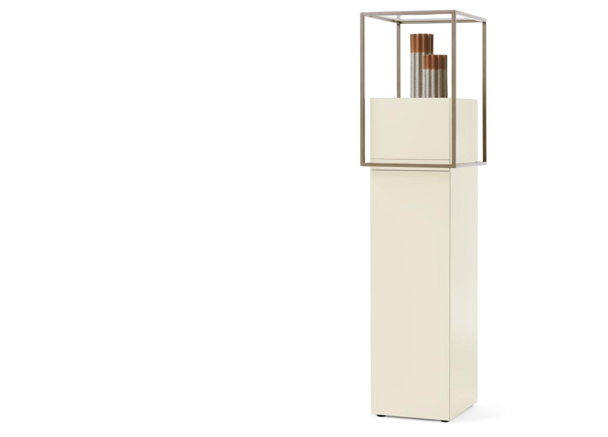 This tall cupboard features a glass cabinet at the top, perfect for showcasing your objects d'art. The body of the tower is made from wood which can lacquered in a range of colours, whilst the metal frame is available in painted black or patinated bronze for a unique finish.
