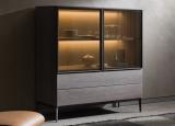 The back panels can be in a matching or contrasting finish including marble. It is also possible to choose the doors with either a 2.2cm or 3.5cm profile with internal panels in a variety of finishes. The metal base is in pewter, iris or copper. You can further enhance your piece by adding a range of internal accessories or LED lighting.