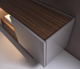 In the centre of the sideboard is an open compartment with a drawer providing volume and creating a sense of movement. The whole sideboard sits on an 18cm high plinth which has two fully extractable drawers with mechanical pressure opening. For inside the cupboards and for the central open compartment it is possible to add an LED lighting kit.