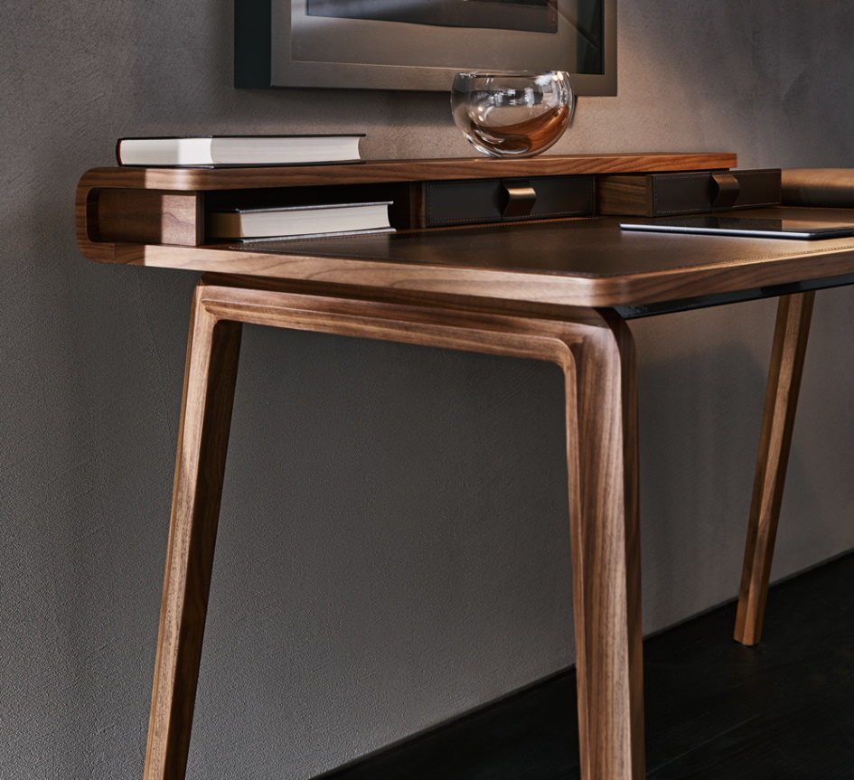The Note desk is the result of Matteo's desire to create a contemporary product with essential characteristics and a refined aesthetic, with technical details demonstrating the woodworking expertise that Molteni&C is devoted to maintaining.