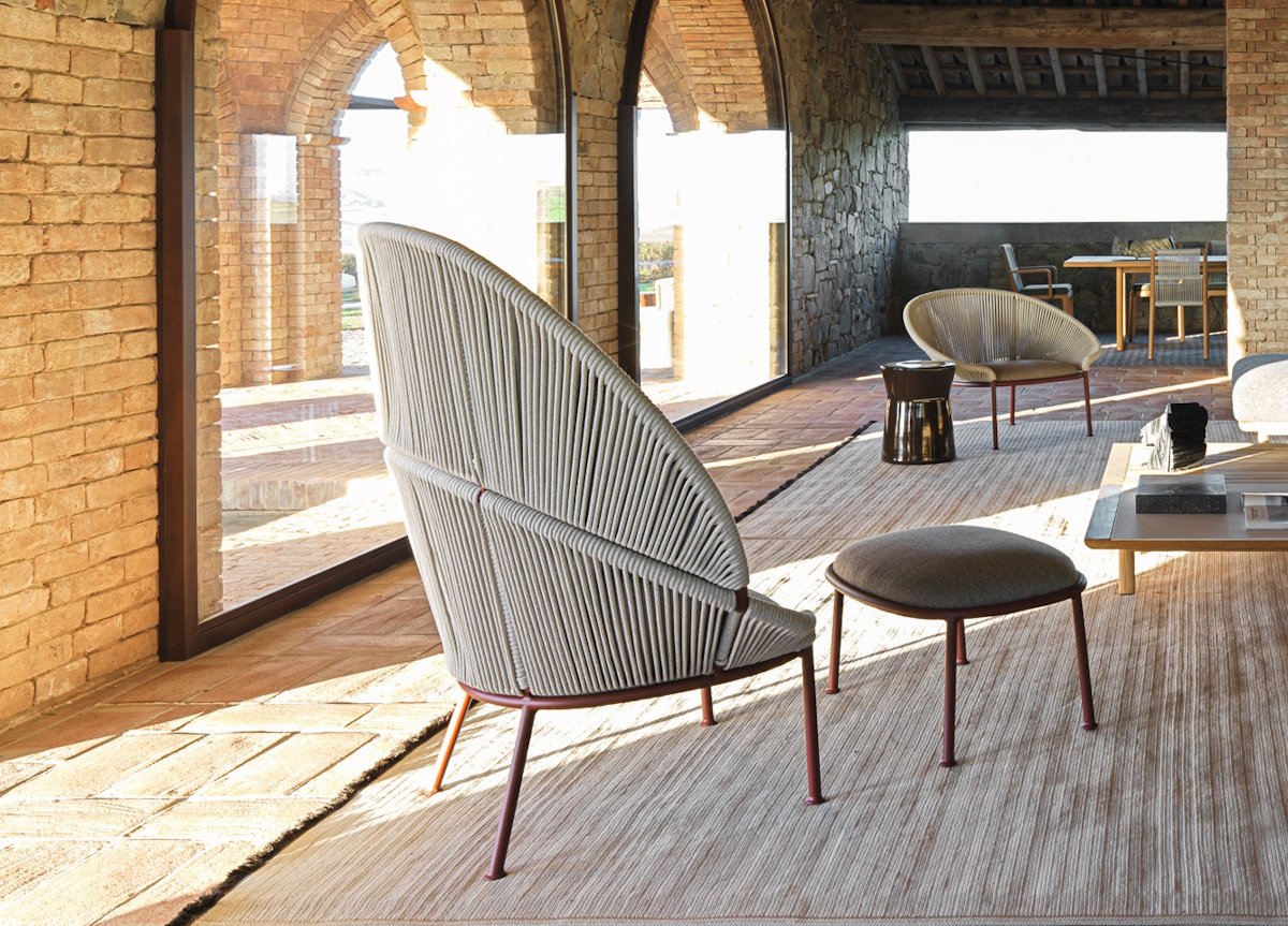The Molteni &C Petalo high-back garden armchair by Vincent Van Duysen embraces with its gentle curves, creating a cozy nook within its delicately enveloping backrest.