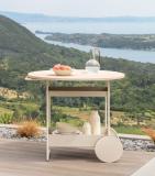 Equipped with wheels for easy manoeuvrability, Ninfea has two storage levels for cutlery, glassware, tablecloths, napkins and bottles, there is also a useful wooden folding table top in either iroko or bleached oak which makes an excellent food preparation station.