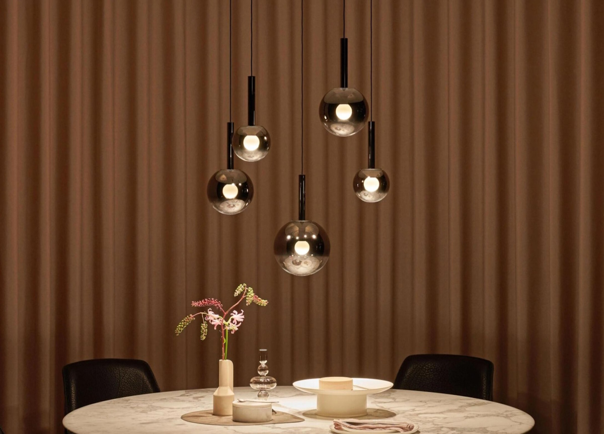 Each light has an innovative LED fireball light source within a glass sphere which is mirrored to create a direct, downward-facing, atmospheric light which can be controlled using state of the art touchless sensors, an Occhio Air app, or remote control. Switch, on or off, or dim, as well as change your required colour temperature from warm evening tones to clear feel-good morning light or choose a cool light for the perfect home-working atmosphere.