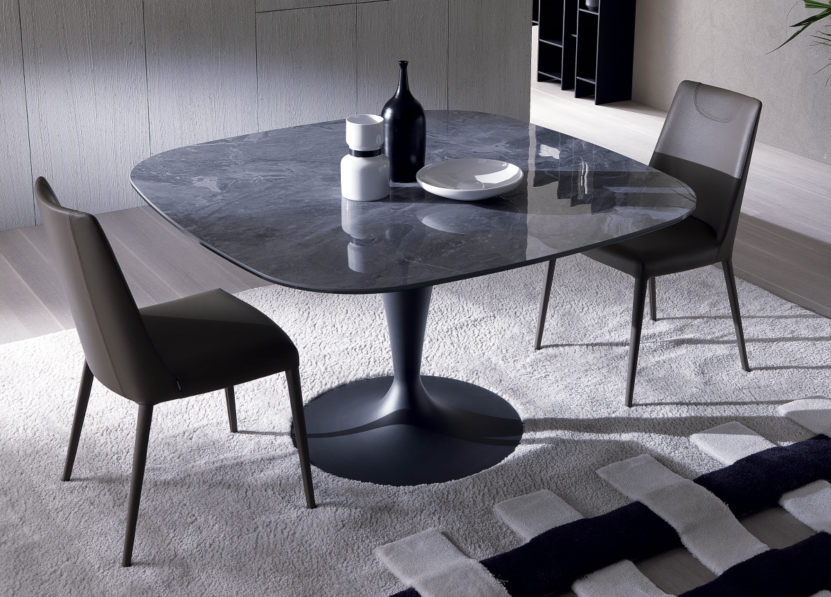 The Bravo square extending dining table from Italian brand Ozzio with an extending lacquered glass or ceramic glass top has rounded edges & a practical pedestal base.
