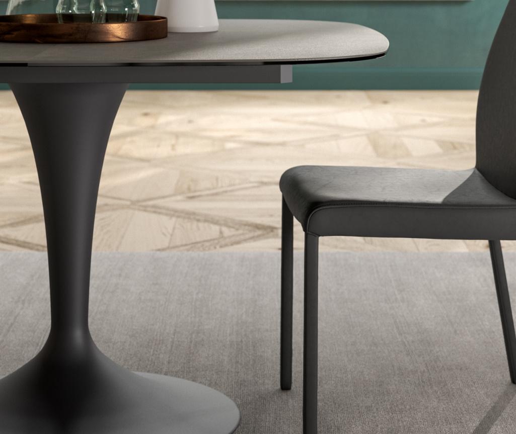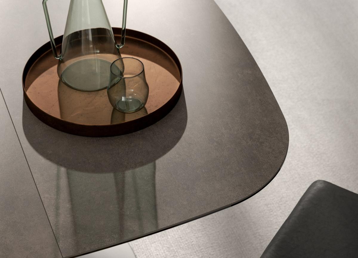 The table top can be selected in several different colours of mark-less glass or pyro-ceramic glass (a tough heat resistant finish) which is available in a textured or marble look. The extension is in matt painted melamine and matches the colour of the base rather than the table top. The metal base can be chosen in either a glossy white, matt black or bronze.