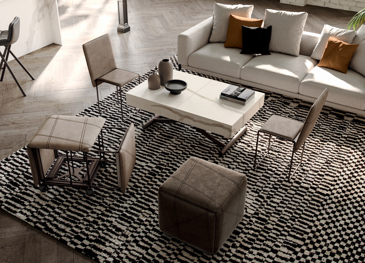 The Cubix by Giulio Manzoni from Ozzio is an amazingly innovative way of providing extra seating for unexpected guests. This comfortable pouf quickly transforms from a single seat into five seats, including four chairs with upholstered seats and backrests.