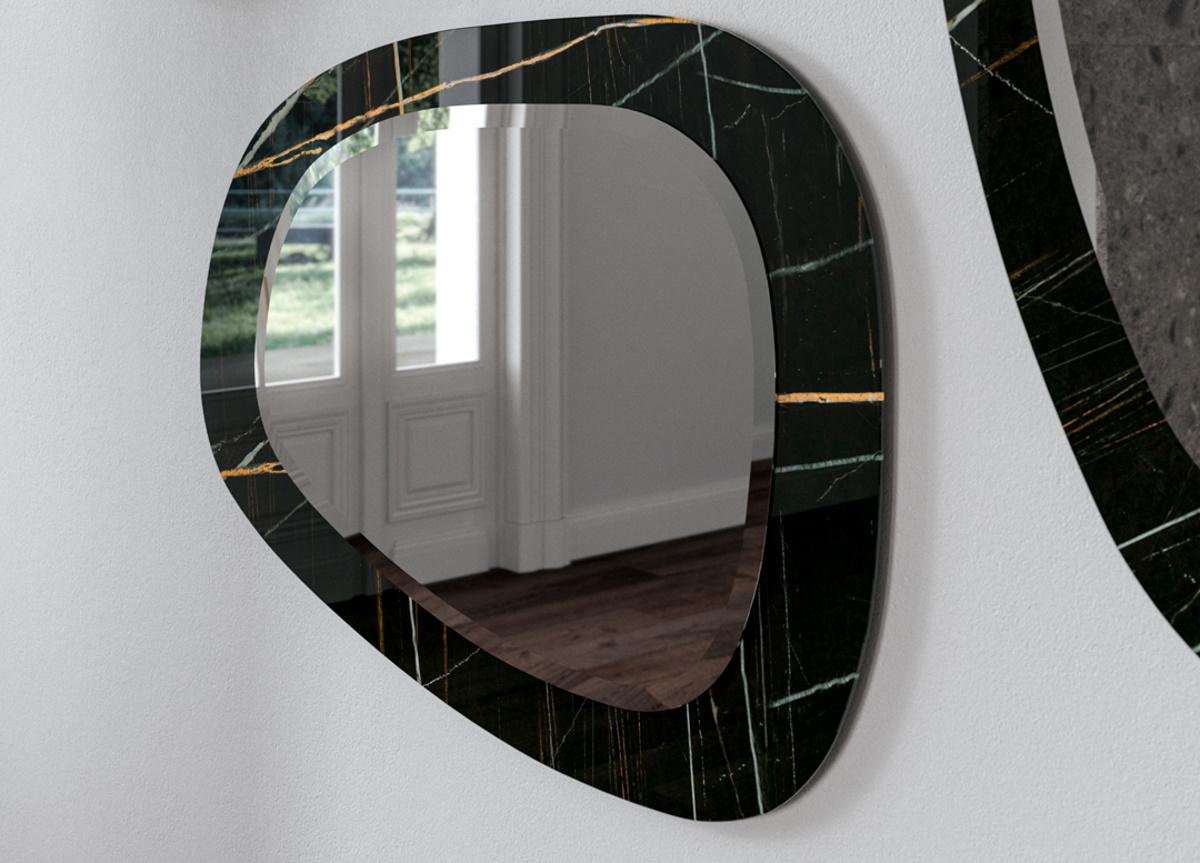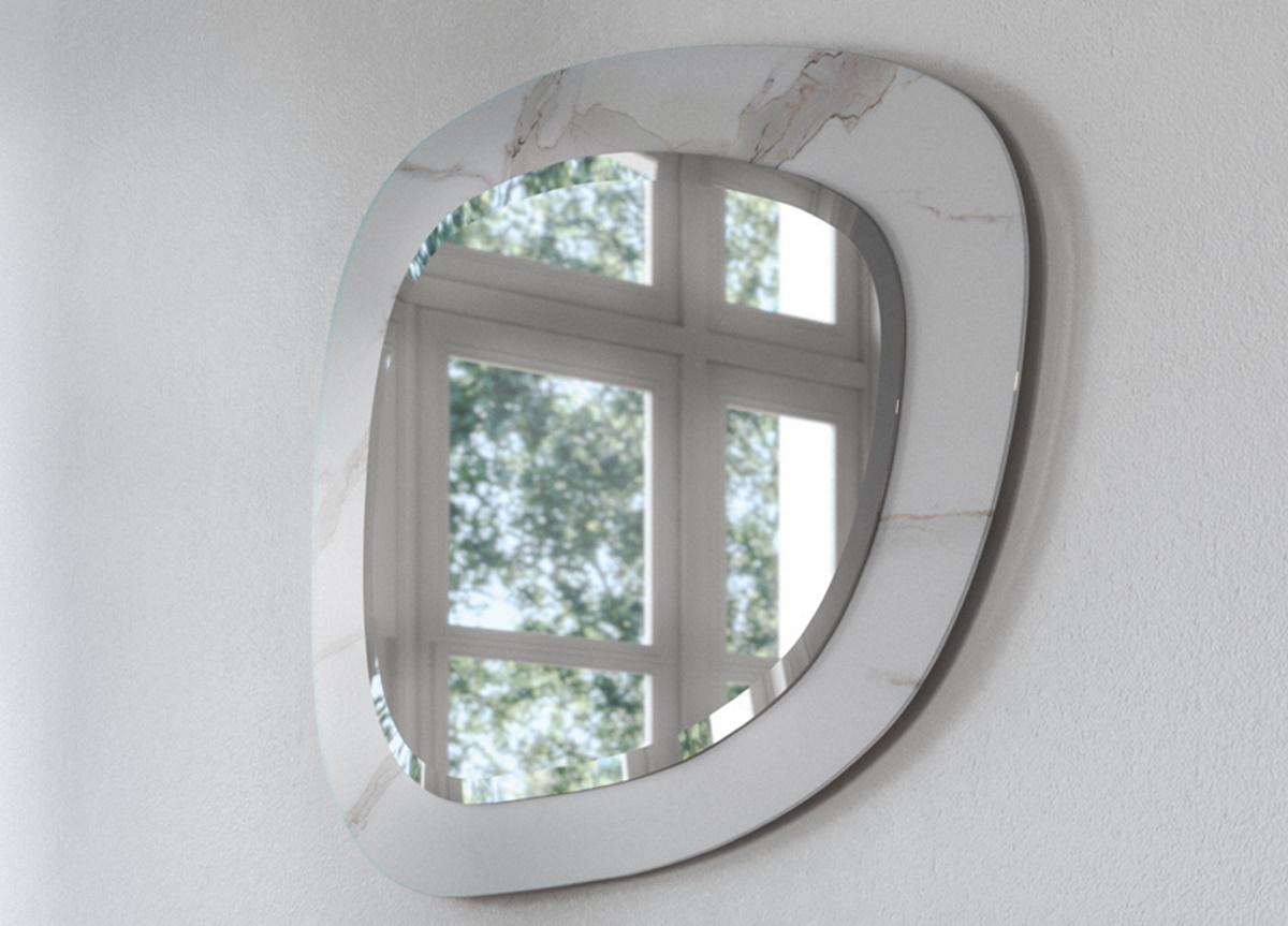The Miami Vice mirror by Studio Ozeta from Ozzio has an asymmetrical organic shape, highlighted by a double depth and an elegant bevel.