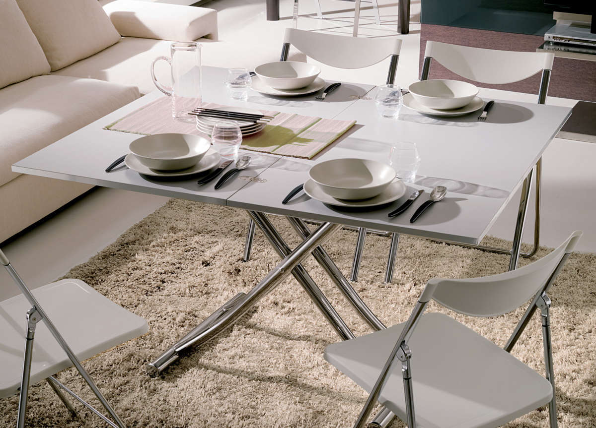 The Mondial transformable table by Studio Ozeta from Ozzio quickly changes from a coffee table to a dining table capable of seating from 6 to 8 people.