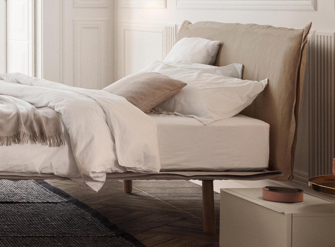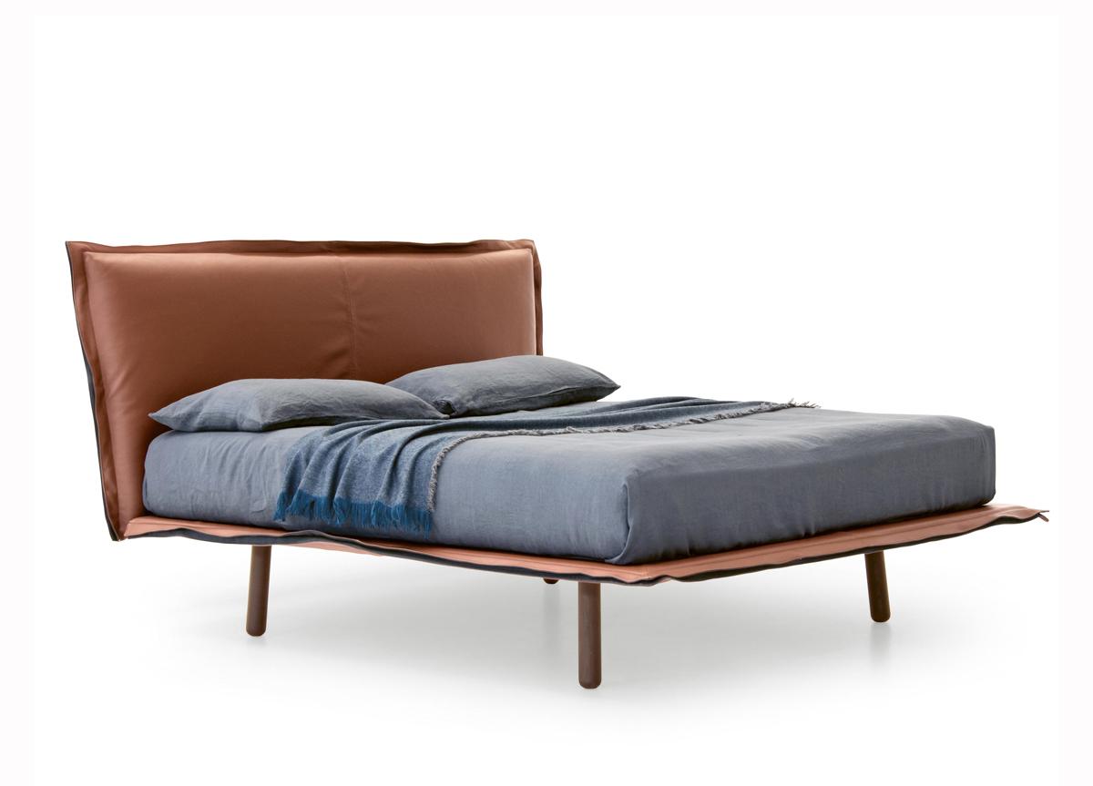 The Aladino bed by leading contemporary furniture brand Pianca is an elegant but comfortable upholstered bed, with a contrasting, large, visible seam allowance around the edges. Made in Italy.