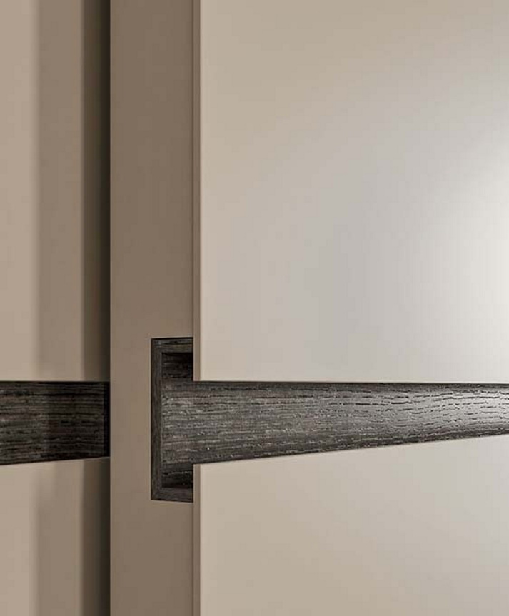 The Pianca Crea sliding door wardrobe has a striking geometric pattern in two styles featuring different sized rectangles built into the door. The recessed handle has a strong graphic impact, cutting across the doors in a horizontal line that enhances the beauty of the composition.