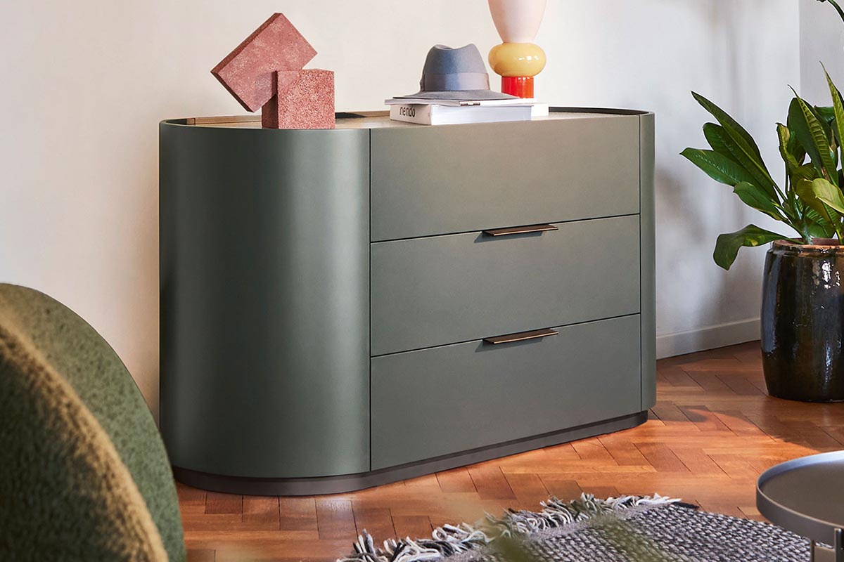 The Dedalo chest of drawers from Italian furniture brand Pianca is a gorgeous three drawer chest with curved ends, a fantastic choice of matching or contrasting top finishes, & leather handles.