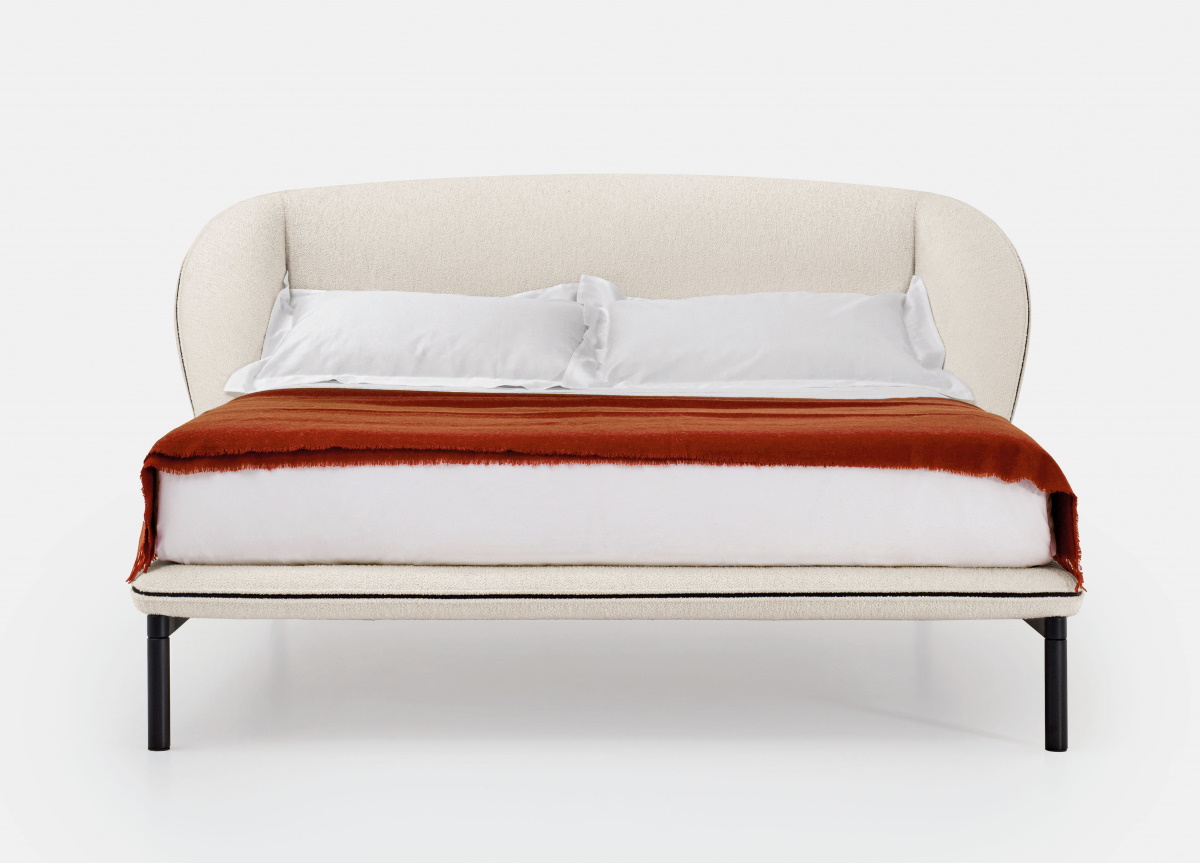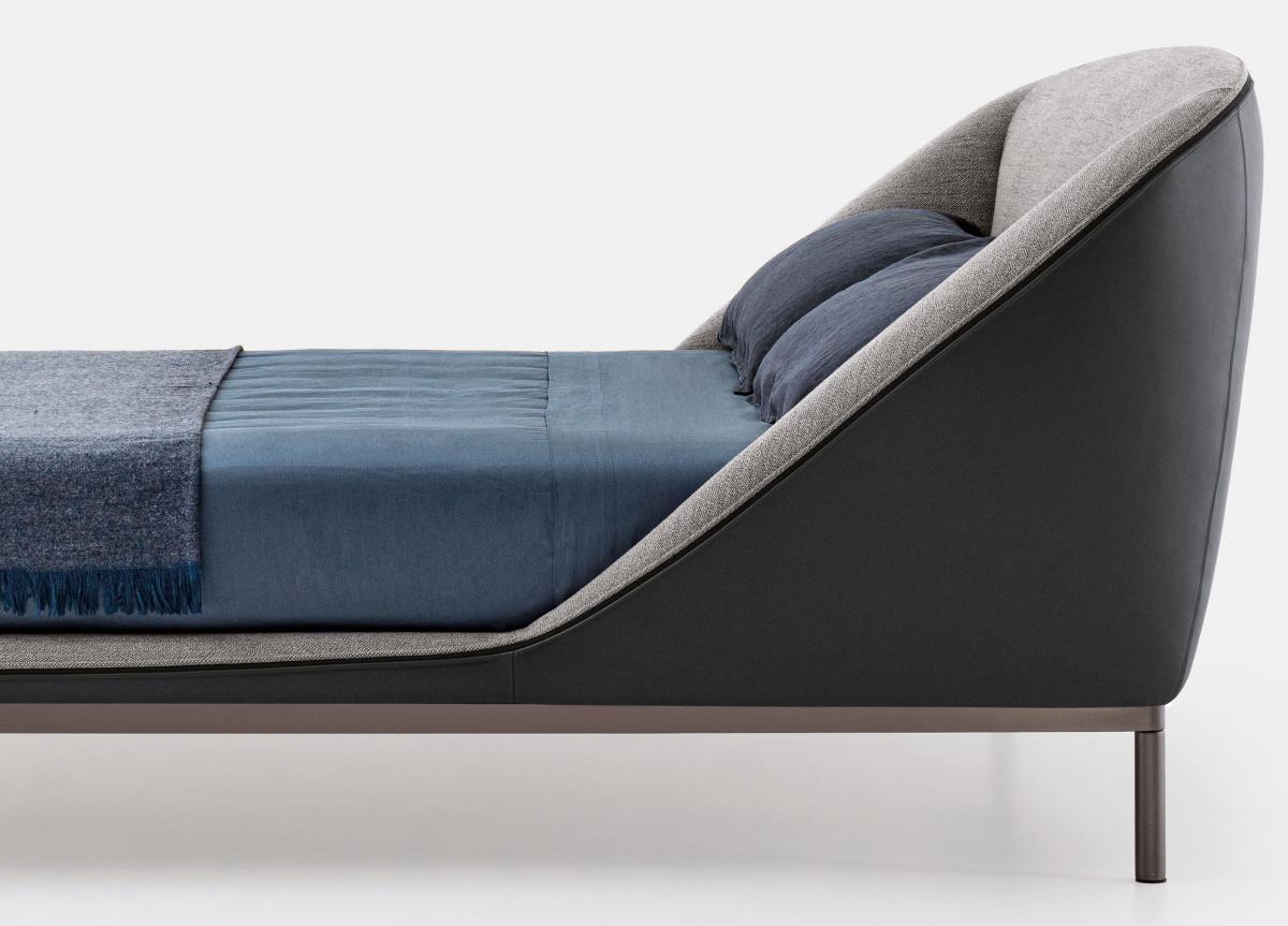 The exposed black zip, is a key feature of the bed’s profile, transforming it from a functional element to a distinctive detail. The bed’s metal base adds further lightness to the structure giving it the appearance of floating above the ground and can be selected in black or white matt lacquer, or a matt or gloss metallic finish.