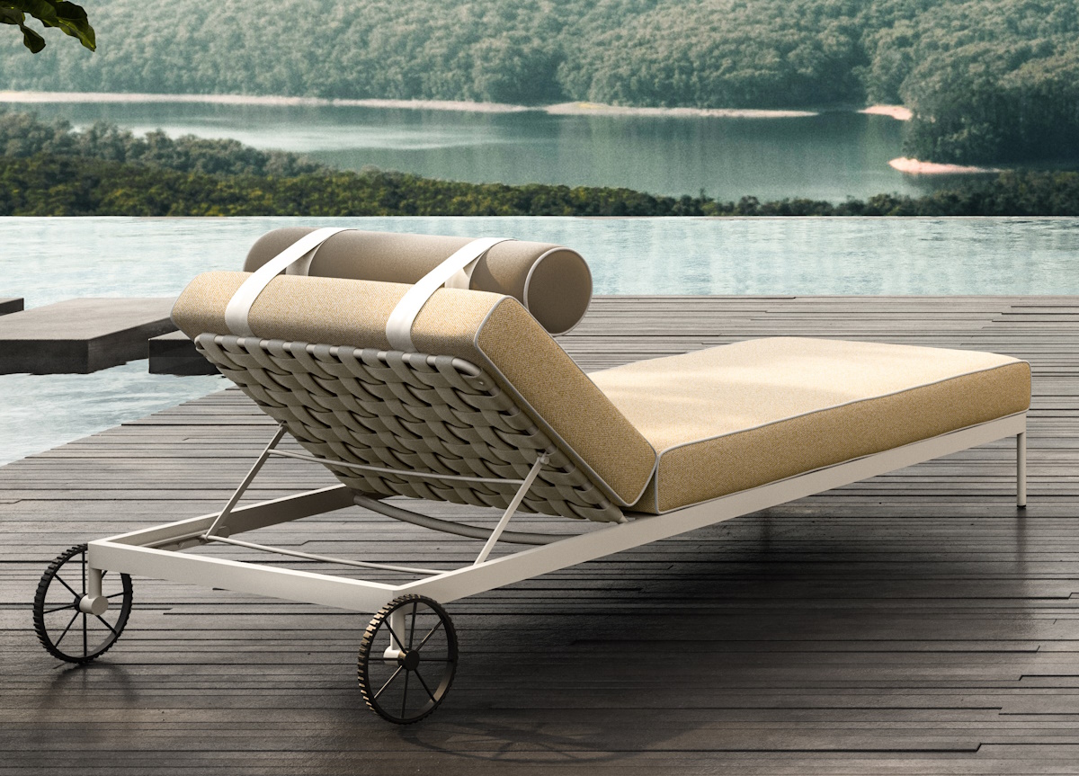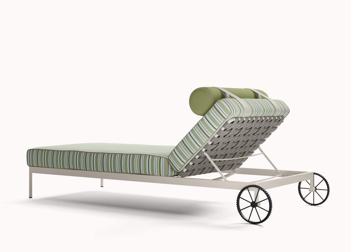 The frame is in tubular stainless steel powder coated in Seta or Espresso with black technical feet & rear wheels in black anodised aluminium. The backrest can be reclined in 3 standard positions and is supported by interwoven grey elastic belts. Optional headrest is attached by straps to match the frame. Removable cushion covers in garden suitable fabrics, with the option to choose different fabrics for the lounger & headrest cushion. Matching or contrasting gros grain piping. Optional outdoor cover.