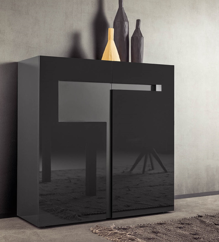 This is the tall version of the Logos sideboard with two doors. The images show it in a lavagna high gloss lacquered finish with lavagna matt lacquer table top and inserts and a glossy cromo metal knob. And in a rovere grigio finish with miele high gloss lacquer top and inserts and a glossy cromo metal knob. Also available in a depth of 55cm - please get in touch for prices. Other versions of the Logos sideboard, as well as the bedroom units can be seen in the related products.