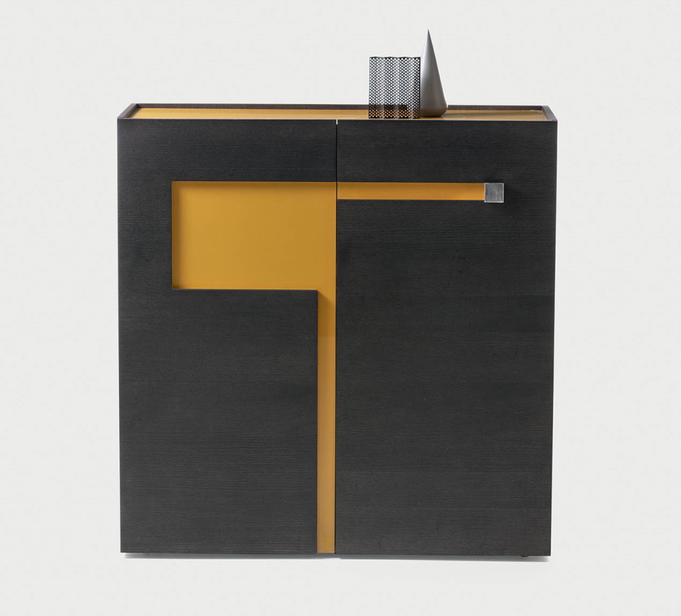 The front of each sideboard is a composition of offset, overlaid inter-communicating elements paying homage to artist and designer Bruno Munari, who conducted a lengthy study of the spatial effects deriving from placing coloured surfaces together.