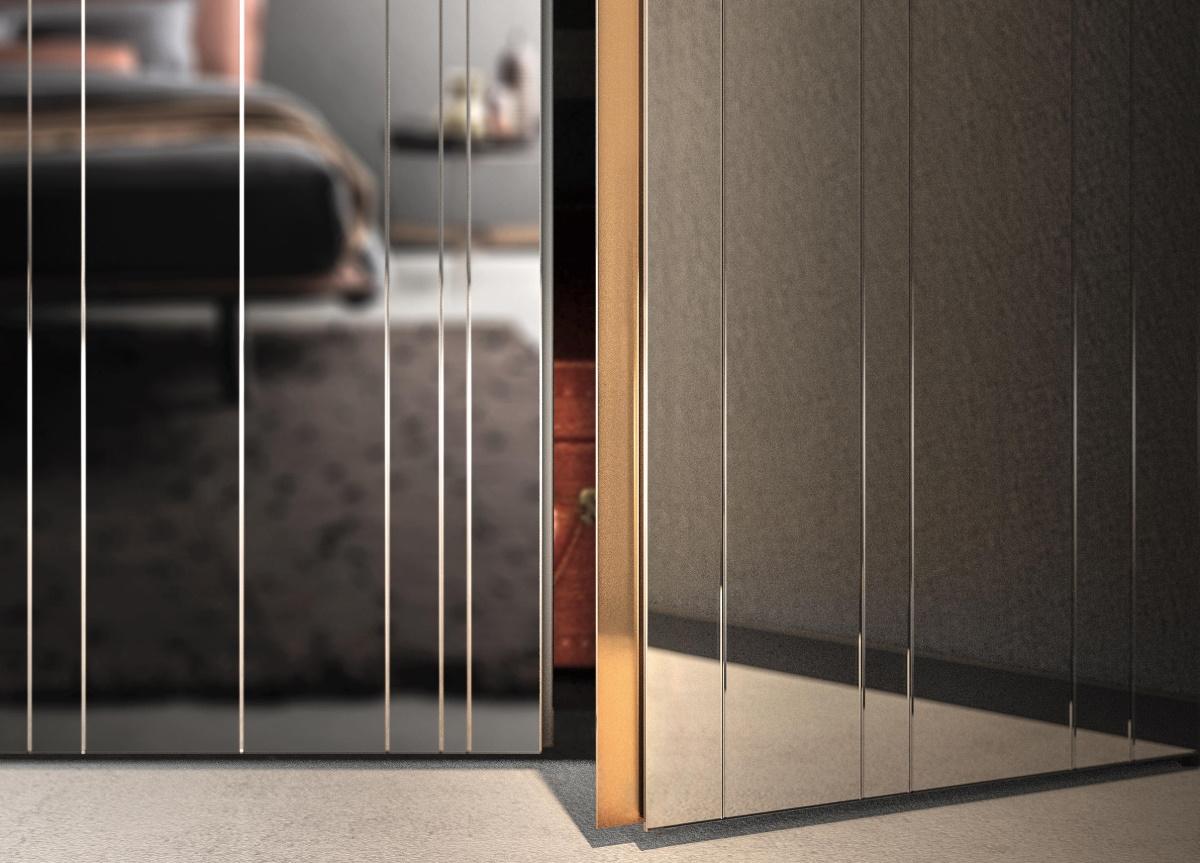 The Raggio wardrobe from Pianca in Italy has stylish vertical incisions running down each door, alternating like rays of light that sketch dynamic, parallel lines. Elegant handles run the whole height of the inner door edge and come in a lacquered aluminium or metallic finish.