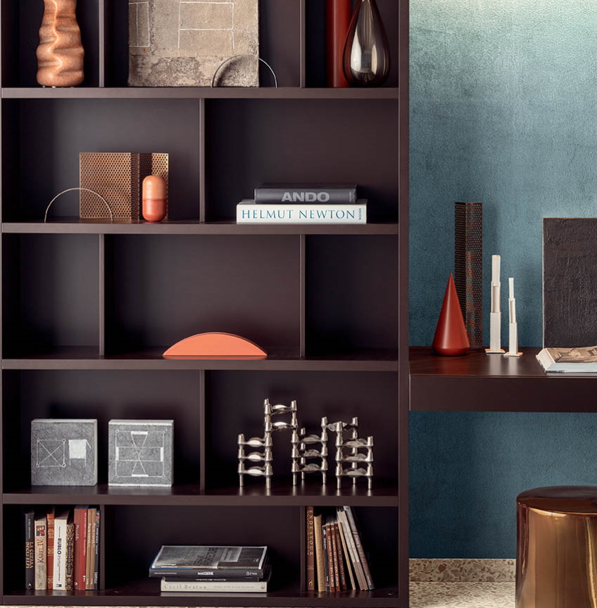 Each composition offers a customised space for everything, creating distinctive combinations and balancing open and closed spaces: Spazioteca is the synergy of order, rhythm and proportion. The classic bookcase concept opens up to new versatile possibilities, providing a place to store objects, books and a TV screen, dividing areas of the home and integrating home office solutions.