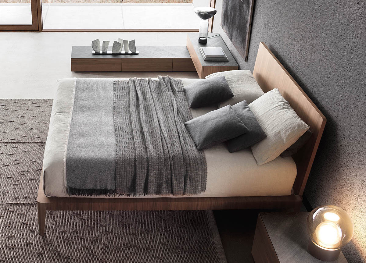 The Pianca Spillo bed is a versatile wooden or matt lacquered bed with the option to have double sided removable padded headboard cover (one side is quilted, one side is plain) & removable cover for the slim base. Made in Italy.