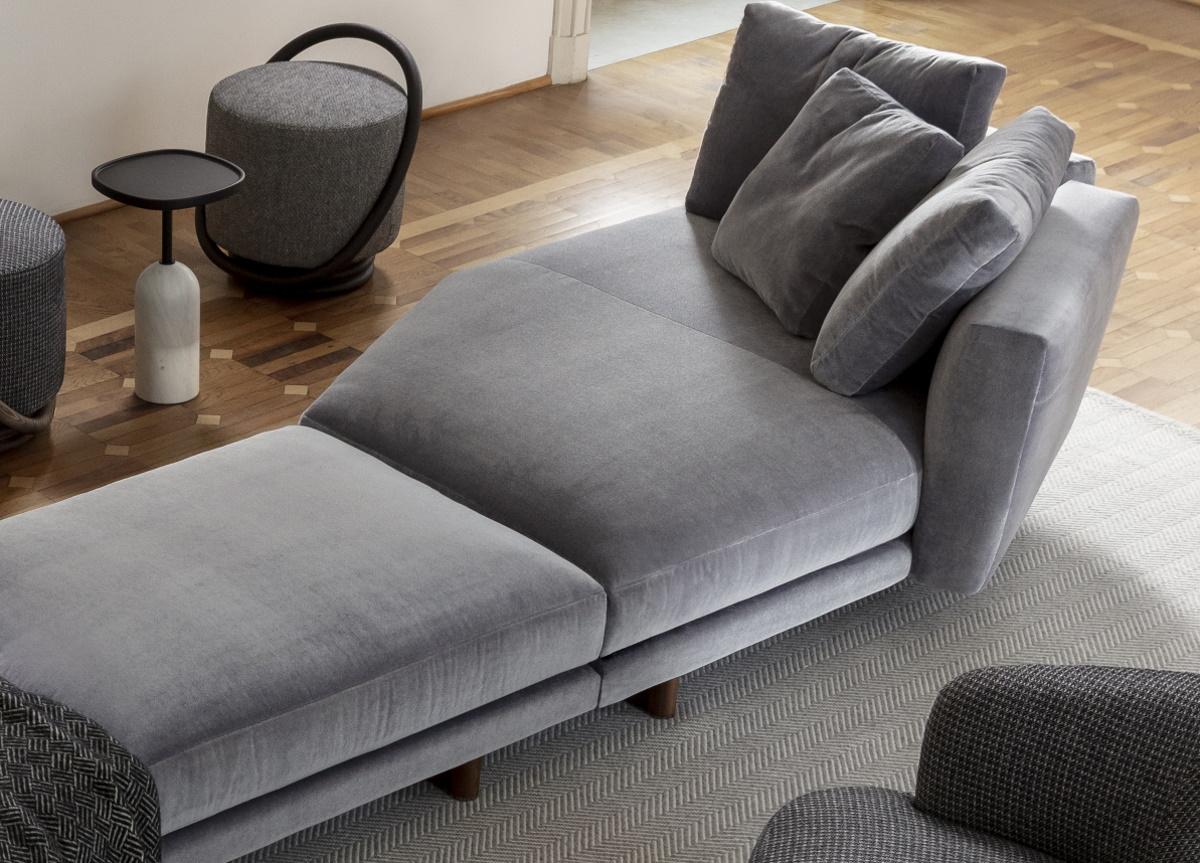 The armrests can be padded, or they can be replaced with a side table in solid canaletta walnut as seen here. The strong frame is in solid canaletta walnut in a range of finishes. Smart feet ends are in black chrome or brushed brass. Removable fabric covers can be selected in a variety of materials, or you can choose from different categories of leather, in which case these covers are not removable.