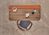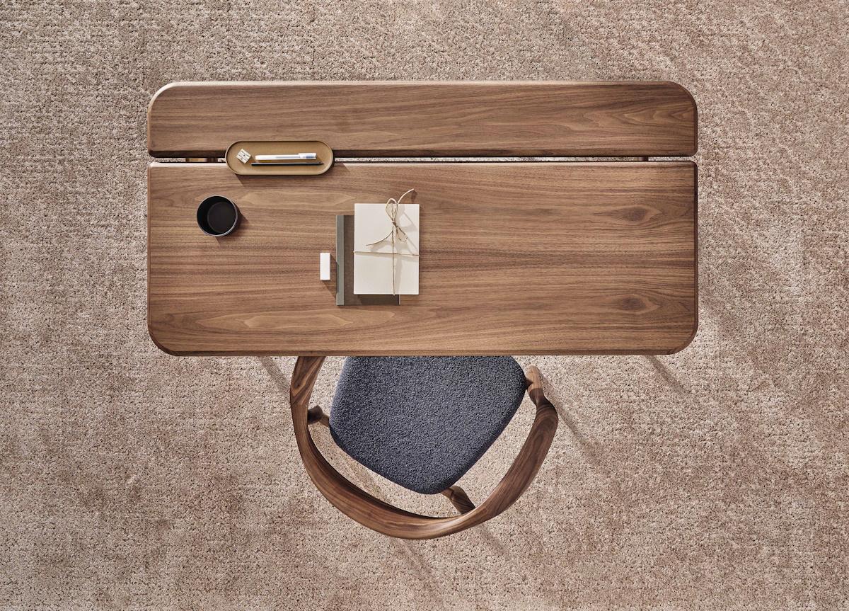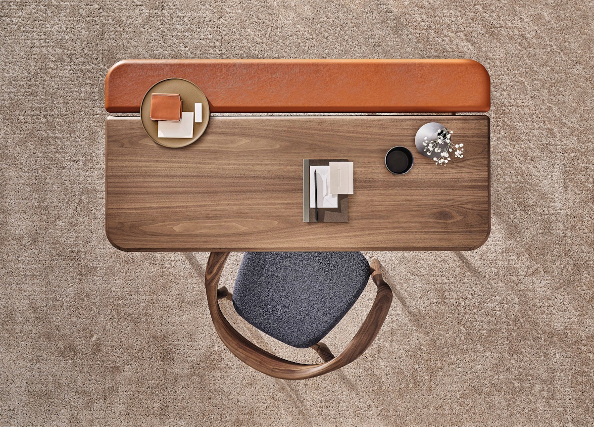 The main desk top is in canaletta walnut with a solid edge with a back part in canaletta walnut in a natural finish or moka or wenge stained, or in marble, or covered by plus leather. It is possible to insert an oval pencil tray and a round holder in champagne finish Baydur® rigid polyurethane in the gap between the tops. The accessories are sold in pairs only.