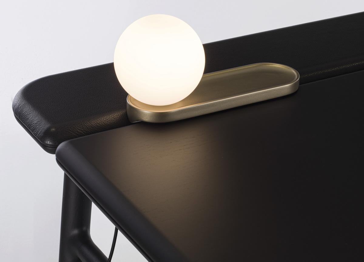 This elegant round lamp was created to match the Aksel desk which is by the same designer, however, it will also look good in any interior setting, The round opal frosted glass diffuser sits on a practical base which is just right for storing small objects.