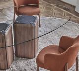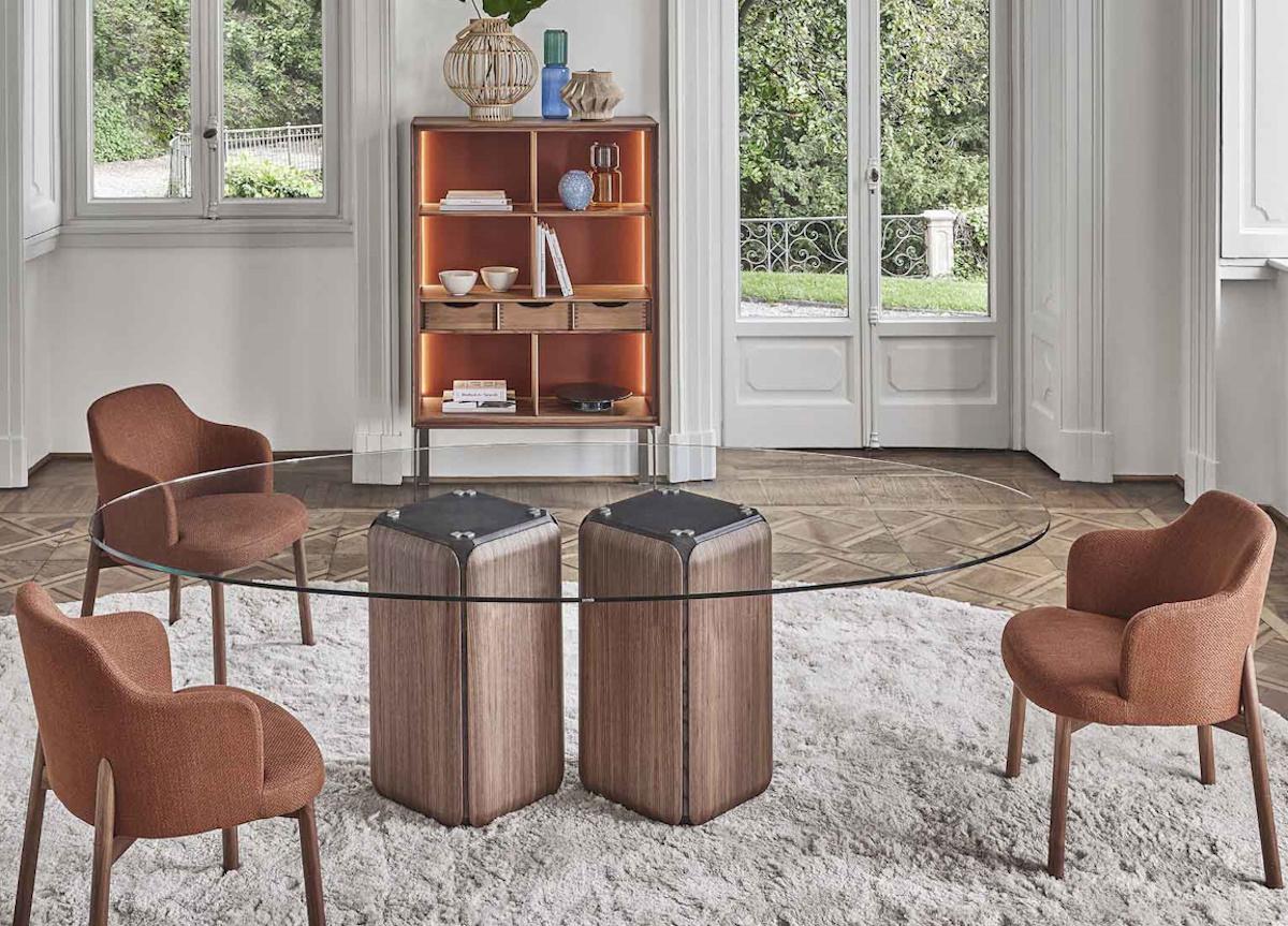 The design of the base, characterised by outer sections in canaletta walnut and a supporting frame in grey-stained ash, serves as the distinctive element of the table, which echoes the silhouette of the Pebble sideboard created by the same designer.