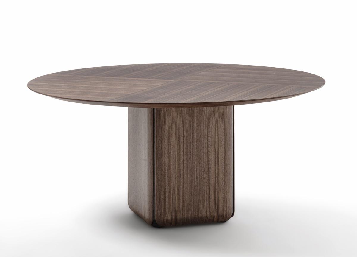 The Porada Bay round dining table by Niccolo Devetag is part of a collection of tables featuring one or two monolithic bases depending on the shape and size of the table top.
