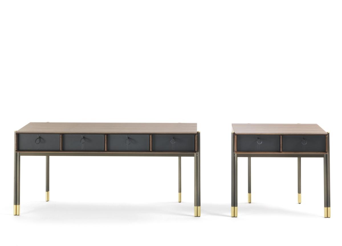Frame in solid canaletta walnut, left natural or stained in wenge or moka. Optional drawers in matching wood, or with cuoio (hide) leather fronts, in grigio scuro (dark grey), Testa di Moro (dark brown) or Invecchiato (aged) leather, or in any of the other cuoio leather colours. Leather drawers have scoubidou braided leather handles, with metal detail. Metal base in bronzoro finish, with brushed brass tips.