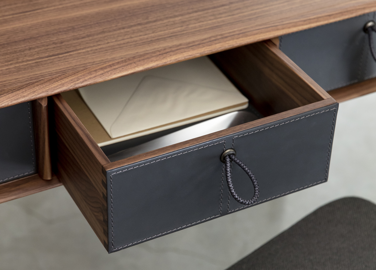Frame in solid canaletta walnut, left natural or stained in wenge or moka. Optional drawers in matching wood, or with cuoio (hide) leather fronts, in grigio scuro (dark grey), Testa di Moro (dark brown) or Invecchiato (aged) leather, or in any of the other cuoio leather colours. Leather drawers have scoubidou braided leather handles, with metal detail. Metal base in bronzoro finish, with brushed brass tips.