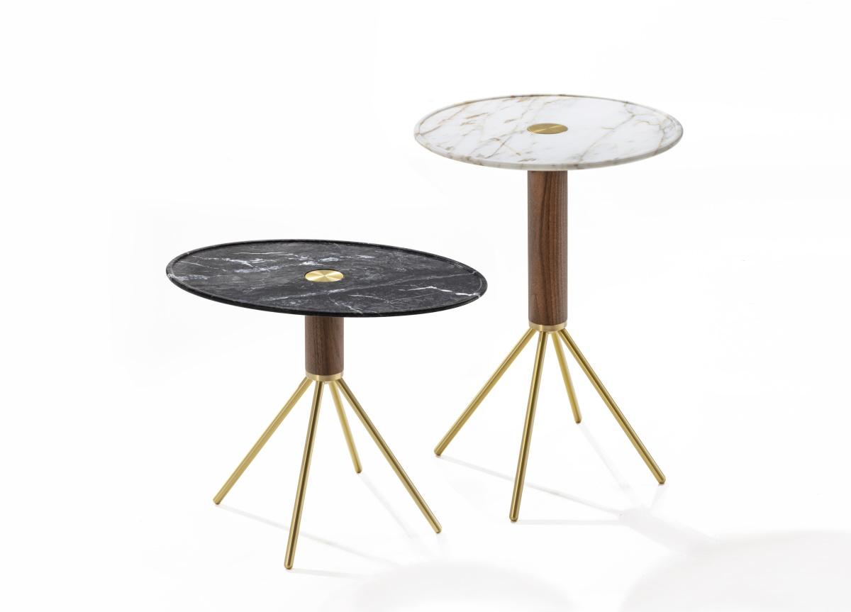 Featuring a table top made from stain-proof oil-treated marble in either white calacatta gold or carnico grey. The base can be selected in black chromed metal or brushed brass, whilst the central pole is in solid canaletta walnut which can be left natural or stained wenge.