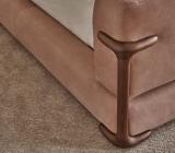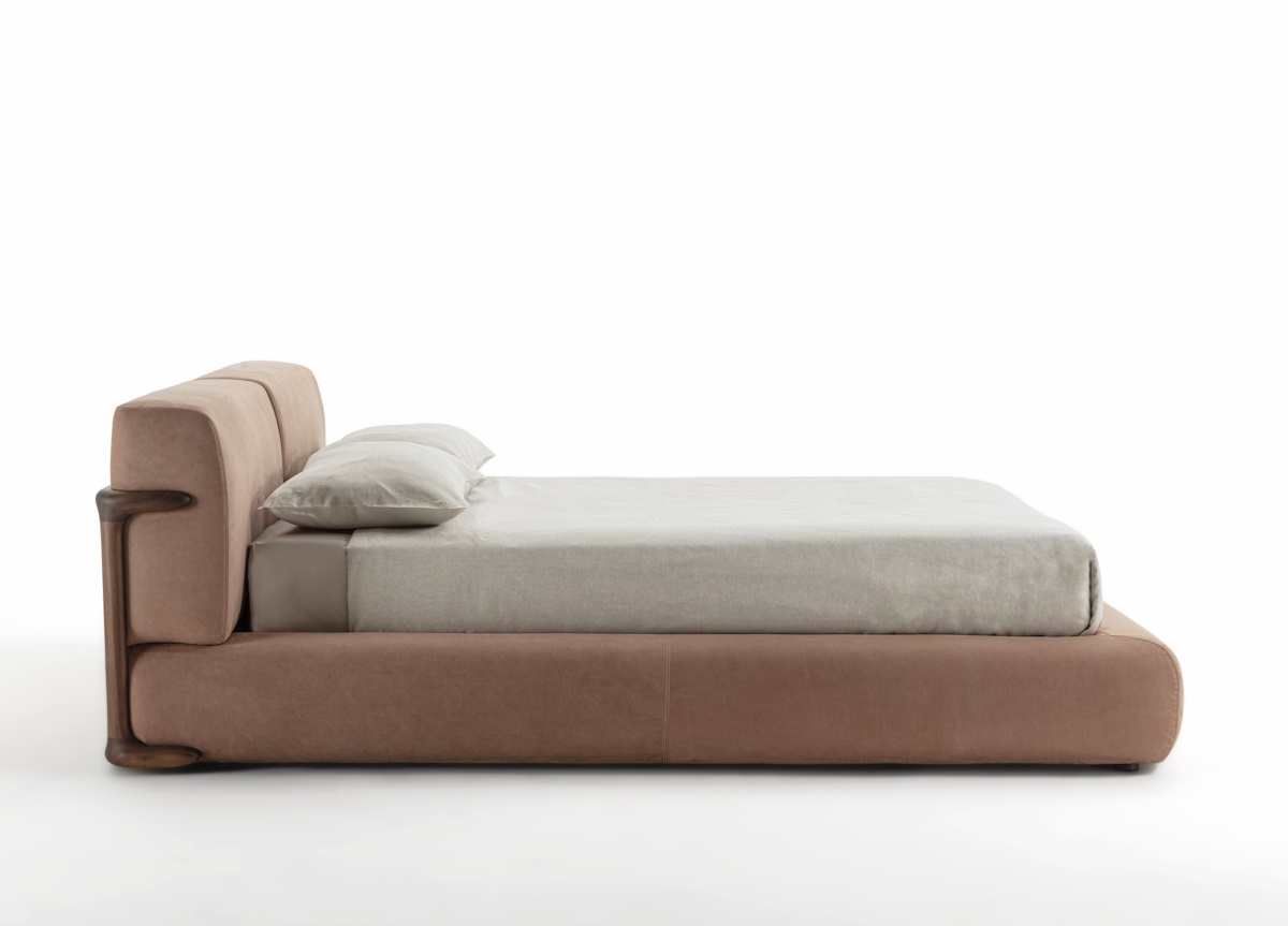A special feature of the Klem collection are the solid Canaletta walnut wood elements which in this bed can be seen on the front and side portions of the upholstered bed base. You can choose the wood in a natural finish, or it can be stained in either moka or wenge.