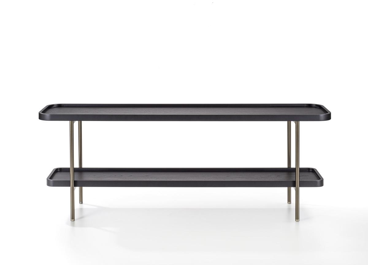 Combining exceptional quality and attention to detail, Koster has two useful shelves and is made from solid frassino ash which can be left in natural wood, stained in several finishes, or matt lacquered in a range of colours. The metal frame is in bronzoro with feet ends in brushed bronzed brass.