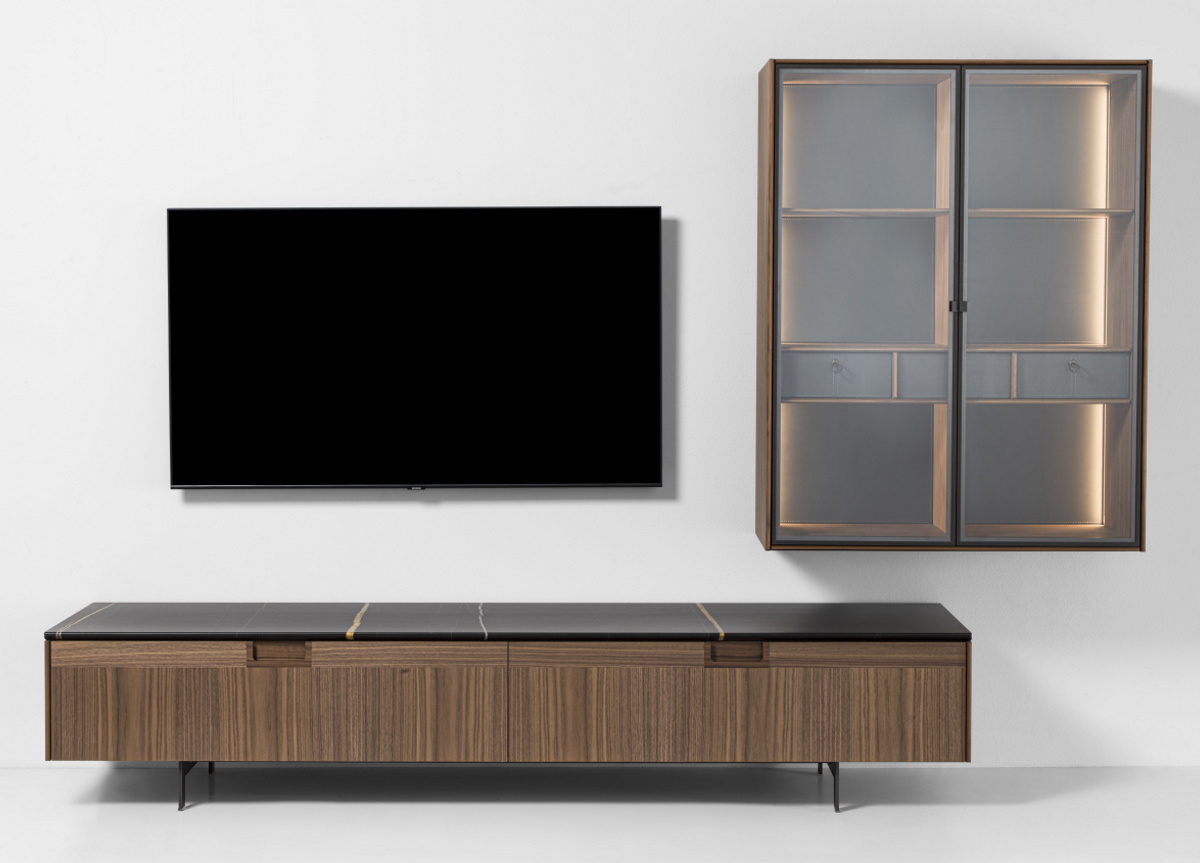 The inside has built-in dimmable LED lighting which operates via a remote control or by using the APP. There are several shelves and open compartments in which it is possible to insert a maximum of three drawers with wooden or cuoio leather fronts.