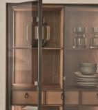 Display cabinet in canaletta walnut wood with two Stopsol super silver clear glass hinged doors with grey pewter metal profiles. Internal built-in dimmable LED lighting which operates via a remote control or by using the APP. The back panel is available in wood, textured bronze metal or cuoio leather in the colours from the Porada collection. You can add up to three drawers with wooden or cuoio leather fronts.