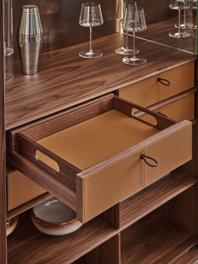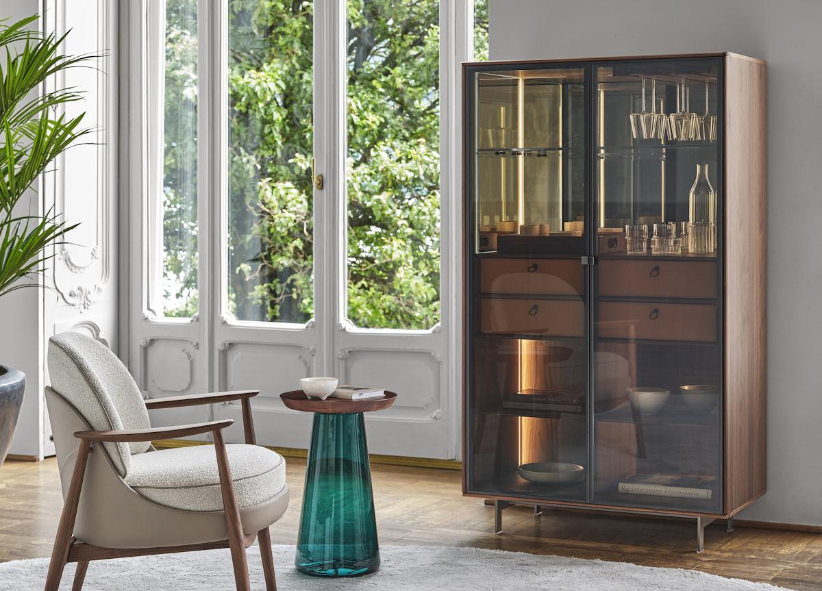 The interior is designed to meet various needs both for living and dining areas: the upper compartments have a back panel in textured bronzed metal with mirrored sides to enhance the perceived spaciousness of the product, the middle shelf is in clear glass. The Canaletta walnut is available in either a natural finish or stained in either moka or wenge.