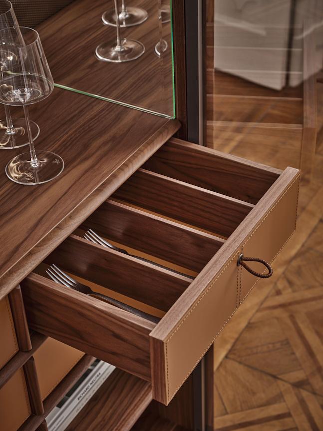 There are four drawers with bottom and fronts covered with cuoietto leather in a range of colours with scoubidou braided leather handles. The upper drawers have useful cutlery dividers and a pull-out tray, whilst the lower compartments are in wood.
