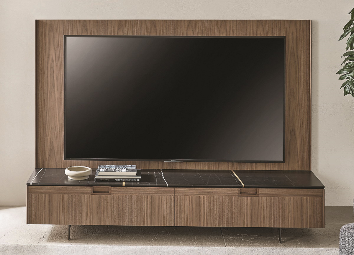 TV unit available in two sizes in canaletta walnut with two or three wooden flap doors featuring inlay characterised by horizontal and vertical grains and recessed handles. The unit top is in canaletta walnut or several marble finishes. Metal base in grey pewter finish. Cable management cut-outs are provided in the back of the unit.