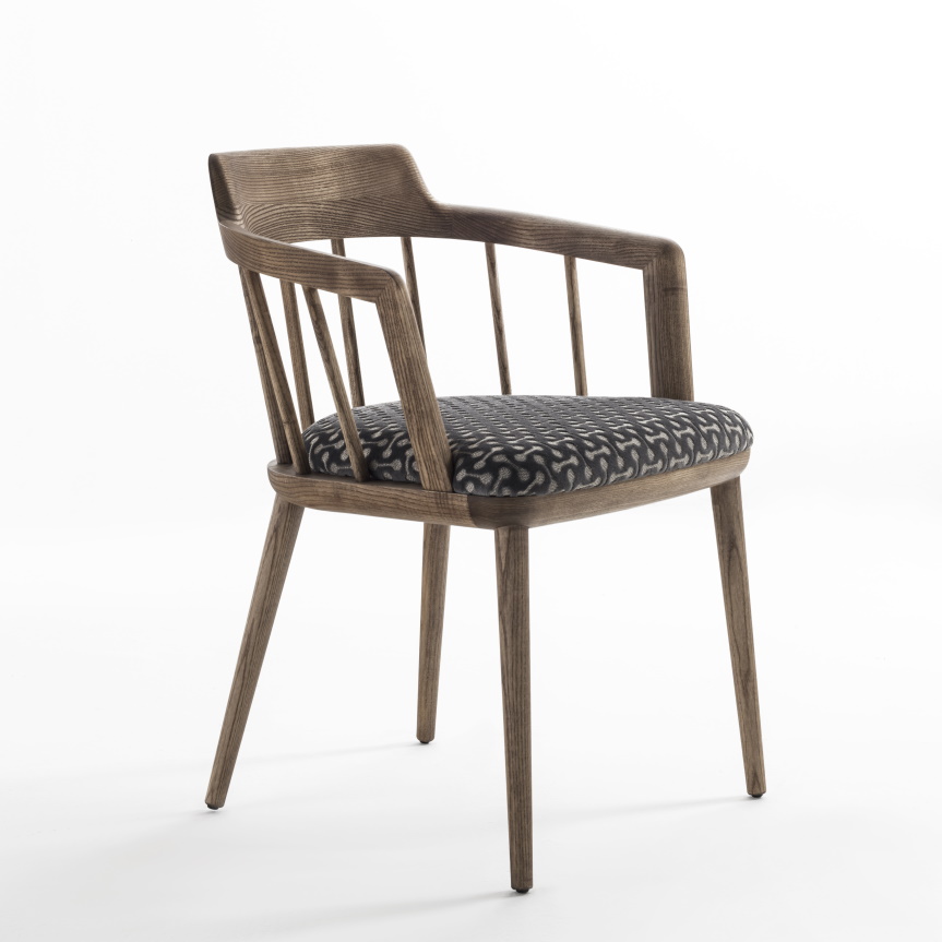 This comfortable dining chair with arms has a strong frame in solid frassino ash which can be left natural, stained, or matt lacquered in a range of colours.