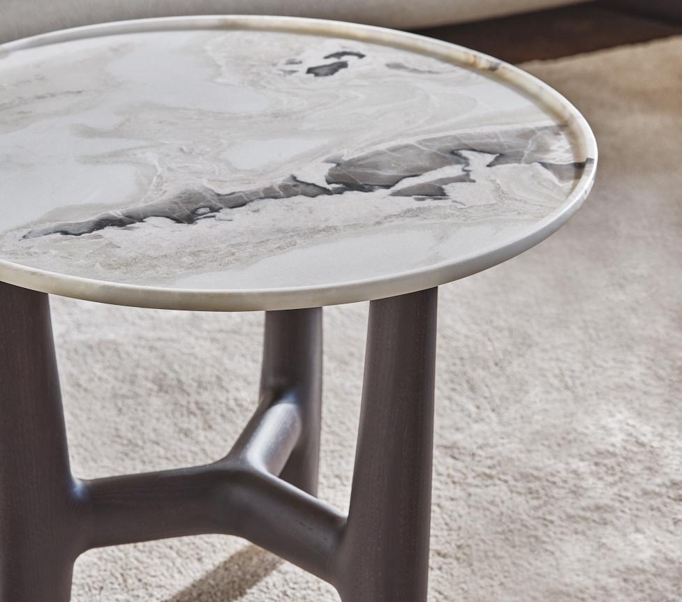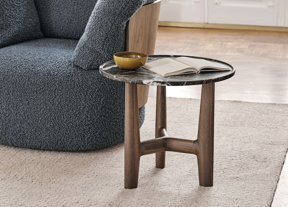 The frame is in solid Canaletta walnut in a natural finish, or stained in either moka or wenge with a table top in either a matching wood or smoked glass (12 mm thick) with a shaped edge, or covered by Cuoietto leather in a range of colours from the Porada collection, or it can be selected in carved marble in either Dover white or grey Carnico.