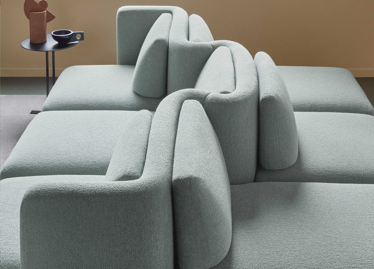 The central backbone is a vertical element that draws pleated curves ready to accommodate, both on the front as well as on the back, an extremely comfortable seat-pouf element of different depths. Suitable for home or contract use the many possible configurations give life to a “hybrid” and flexible sofa.