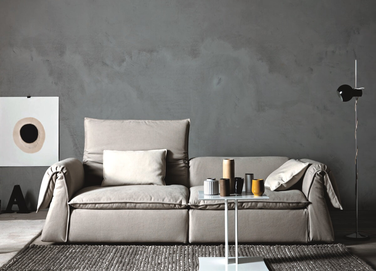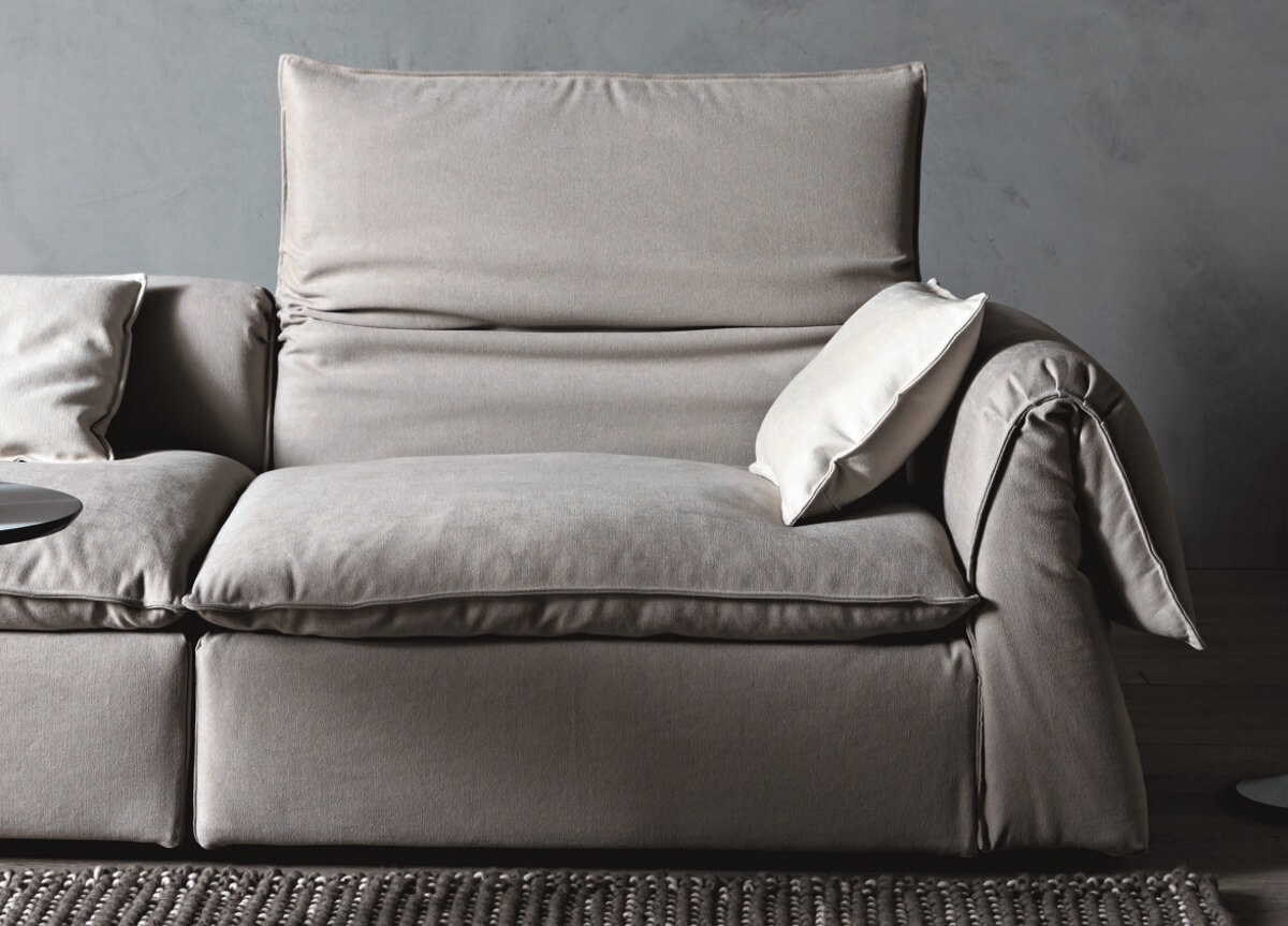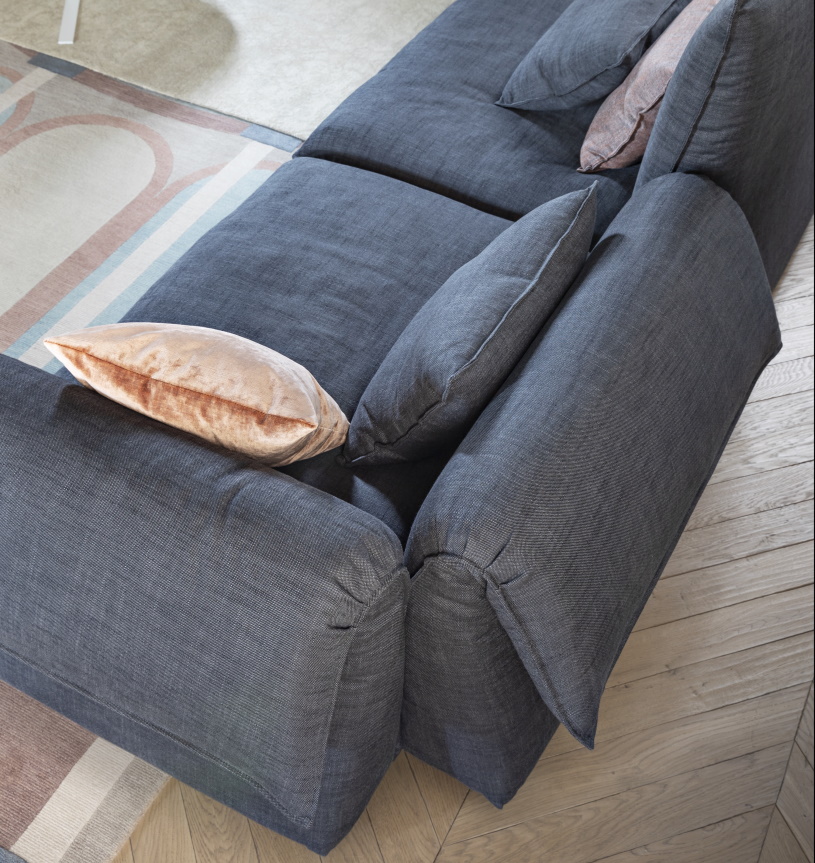 A key feature of Les Femmes is that its backrests and armrests can be arranged either folded or extended. When both are folded the sofa takes on a conventional aspect, however, when raised and extended the sofa becomes snug, reassuring and even more cosy.