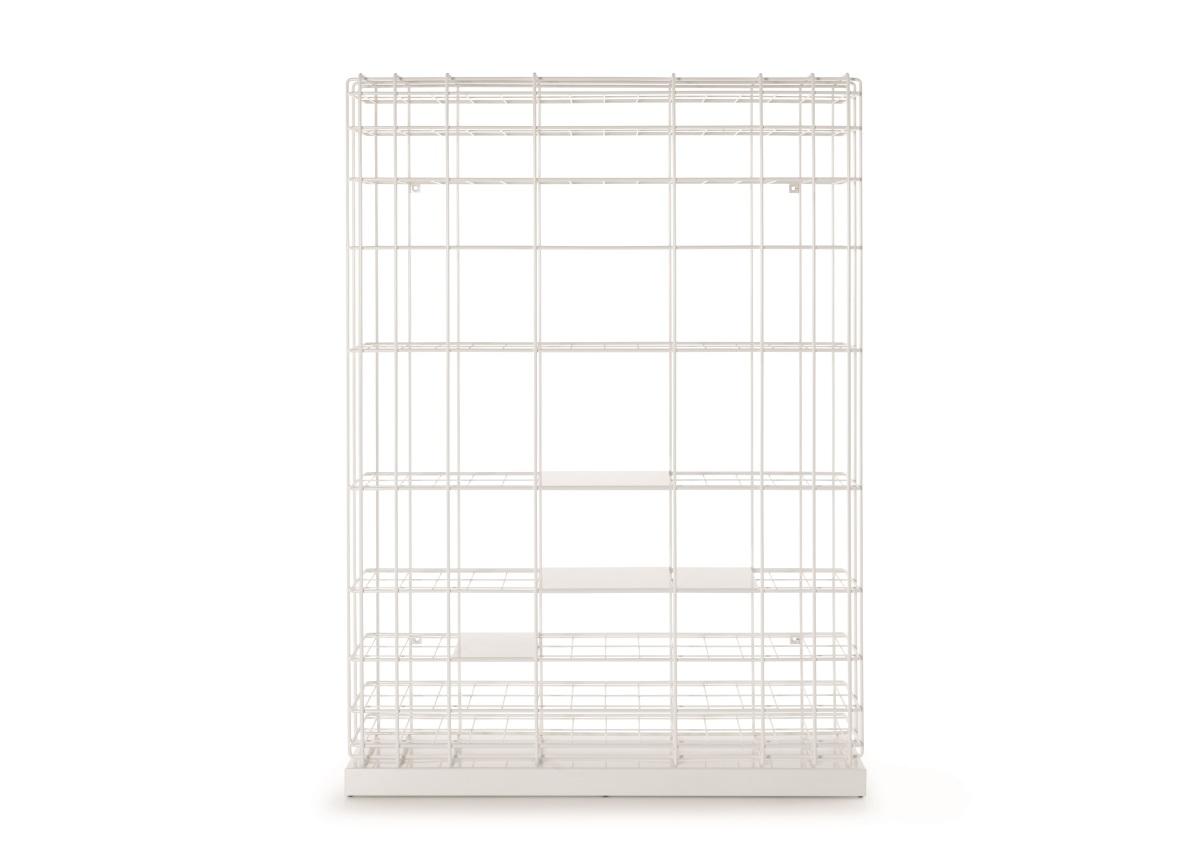 Available in two sizes, in either glossy white, or black and made from coated and soldered tubular iron, with optional moveable sheet-metal shelves and supportive base.