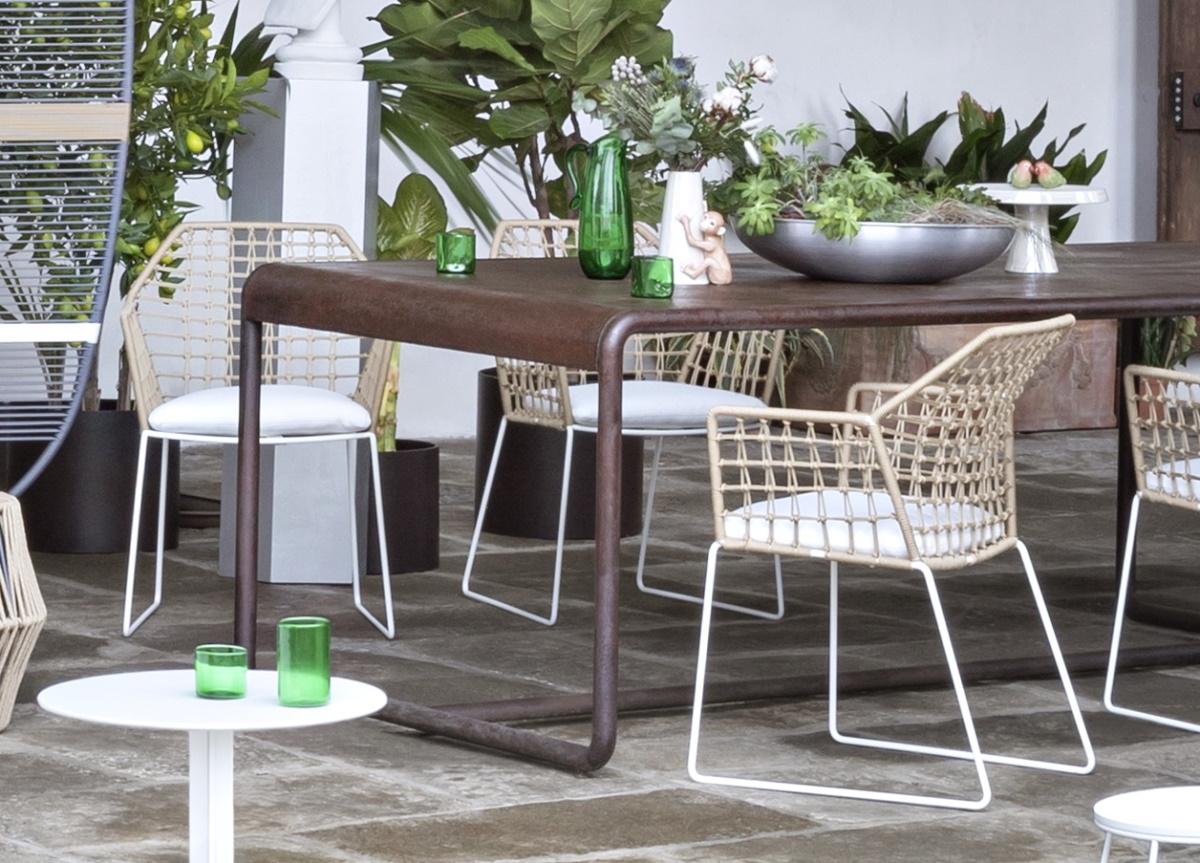 The seat back features intricately woven polyethylene ropes which can be selected in a range of different colours with a tubular metal frame painted white or black and specifically treated for outdoor use.